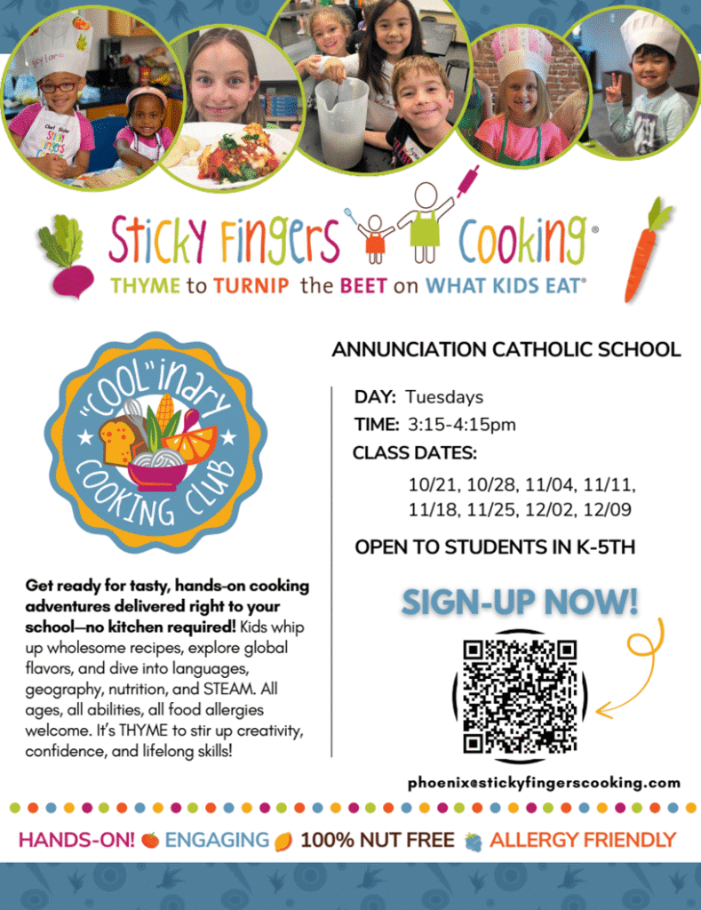 - The next Sticky Fingers Cooking session is open! Fall session is from Oct 21st – Dec 8th, Tuesday after school. Grades K-8 are welcome to learn to cook healthy and fun food!