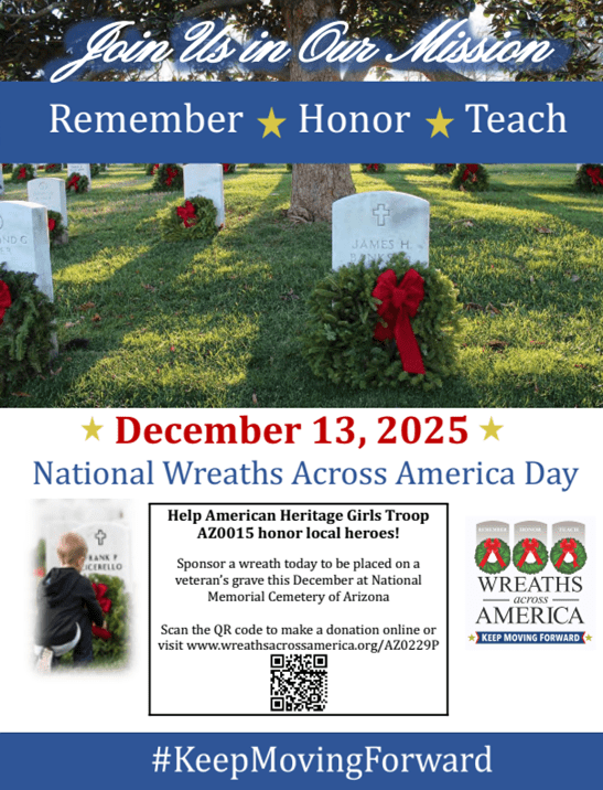Join our American Heritage Girls troop in supporting Wreaths Across America by sponsoring a wreath to be placed on a veteran’s grave this December at the National Memorial Cemetery of Arizona. Visit their table after Mass this weekend or go online today www.wreathsacrossamerica.org/AZ0229P