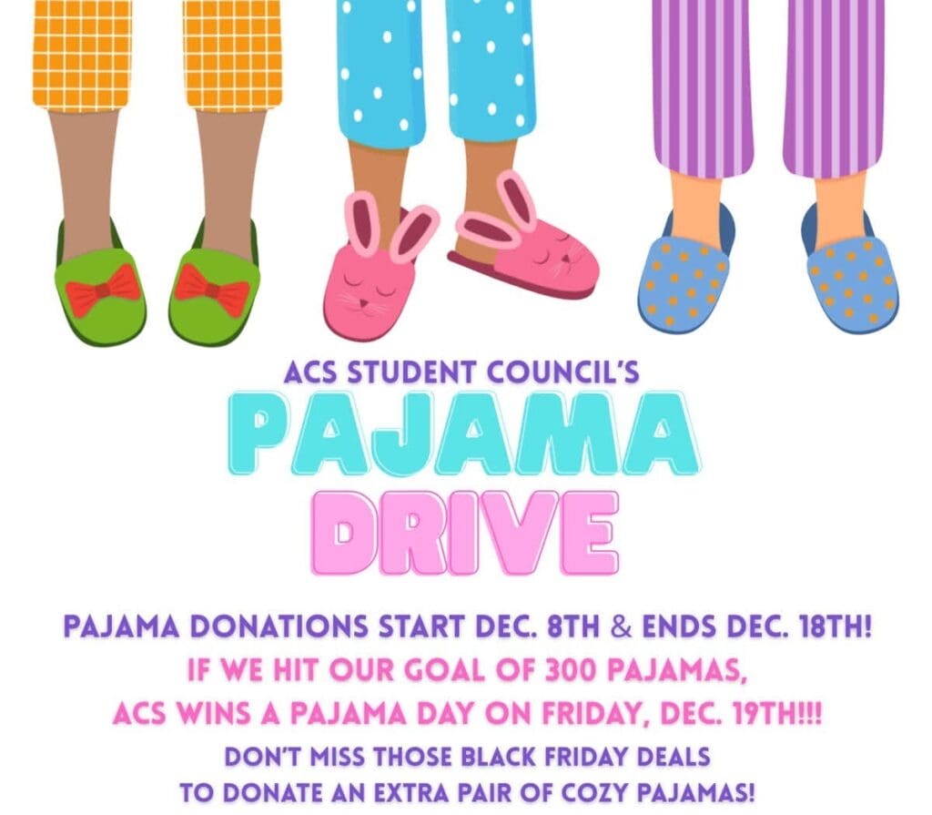 - Now through Wednesday, December 18: The ACS Student Council Pajama Drive is in full swing! We are working with Pajamas4azkids.org and hope to reach our goal of 300 pajamas! Drop them off at the school office or in the boxes located in the school building. Check out the sales at Target and Wal-Mart and help a child in need have a warm and cozy bedtime!