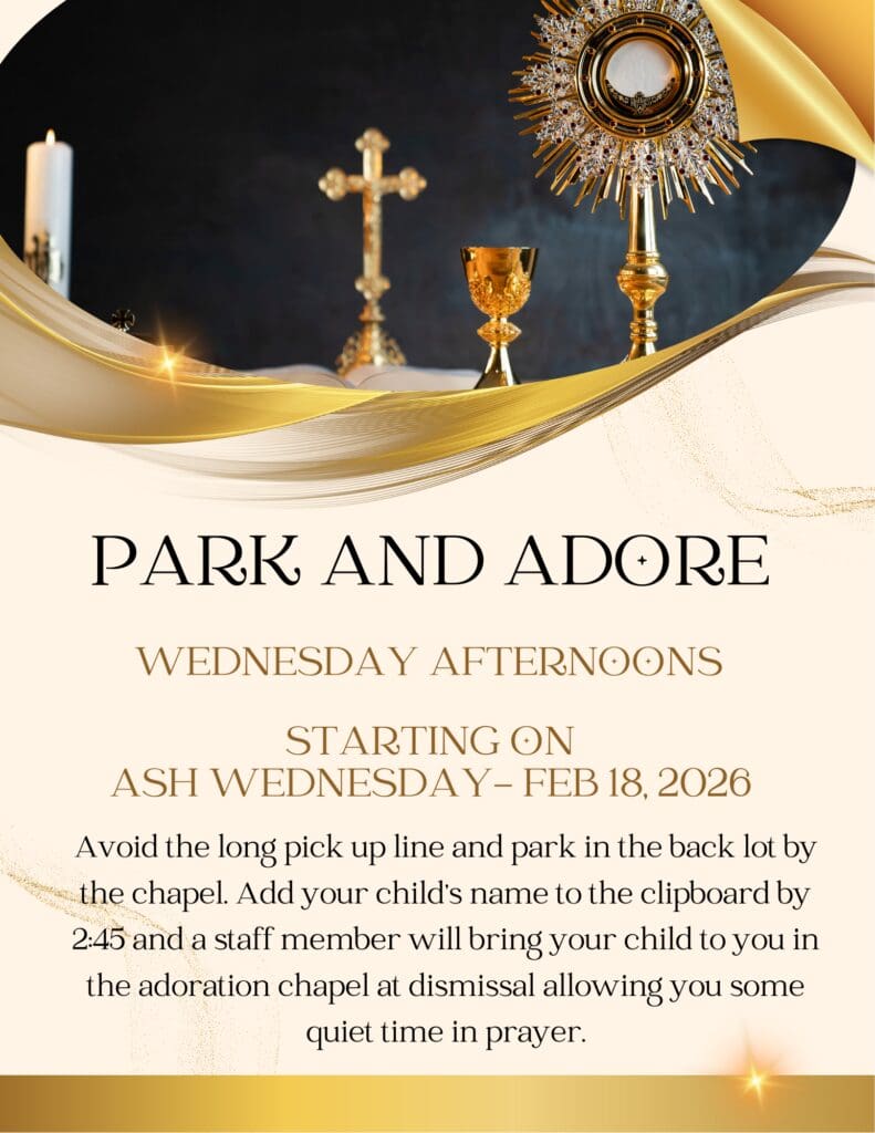 - Starting on Feb. 18: Park and Adore on Wednesday afternoons. See below! Spend a little time in adoration and your child will be brought to you in the adoration chapel at dismissal.