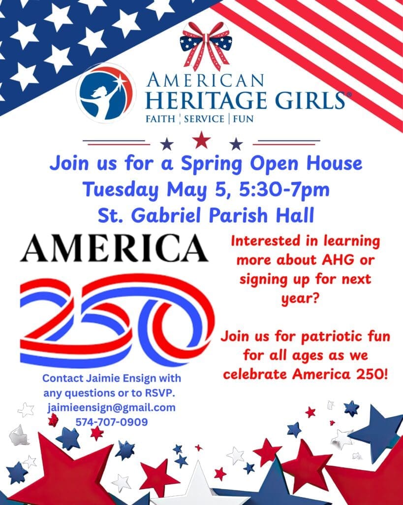 • May 5, Tuesday: American Heritage Girls (AHG) Open House from 5:30-7pm in the parish hall. Come learn about AHG for your daughter and have some patriotic fun!