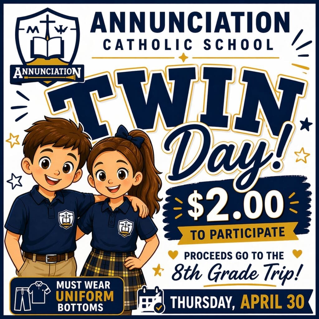 • Start planning your outfit now! Thursday, April 30th, find a friend or a few and wear matching shirts for the day to be twins! Uniform bottoms required. Proceeds benefit the 8th grade trip!